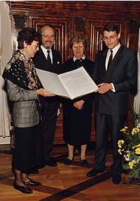 v. l. n. r. Stadträtin Helga Budde, Stifter Johann Philipp Frhr. von Bethmann, Stadtverordnete Christa-Mette Mumm von Schwarzenstein und der Preisträger A. Hansert |
